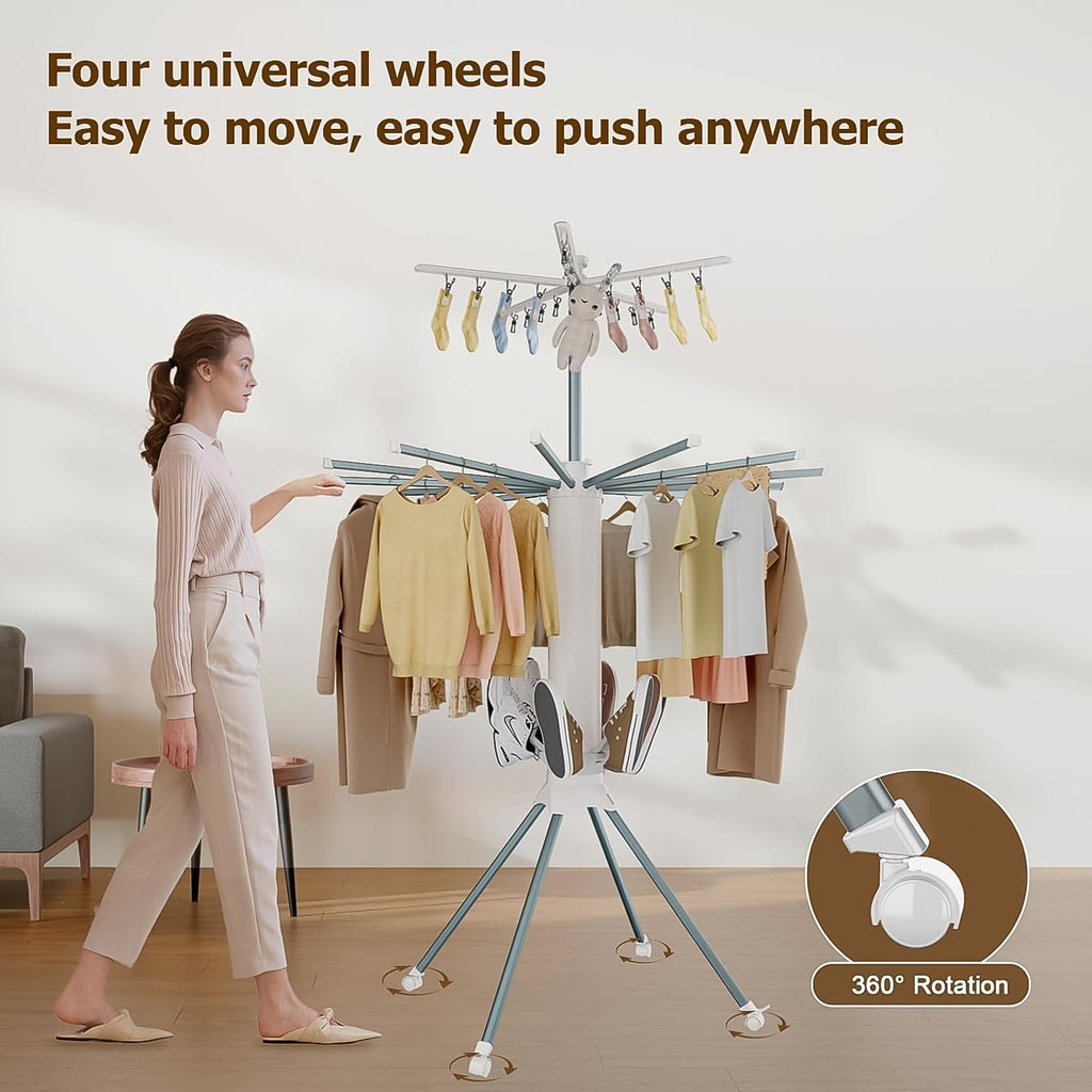 Multi-Layer Foldable Clothes Drying Rack with Rotating Arms, Shoe Holder, and Hangers – Portable Indoor & Outdoor Laundry Dryer Stand with Wheels for Home Use