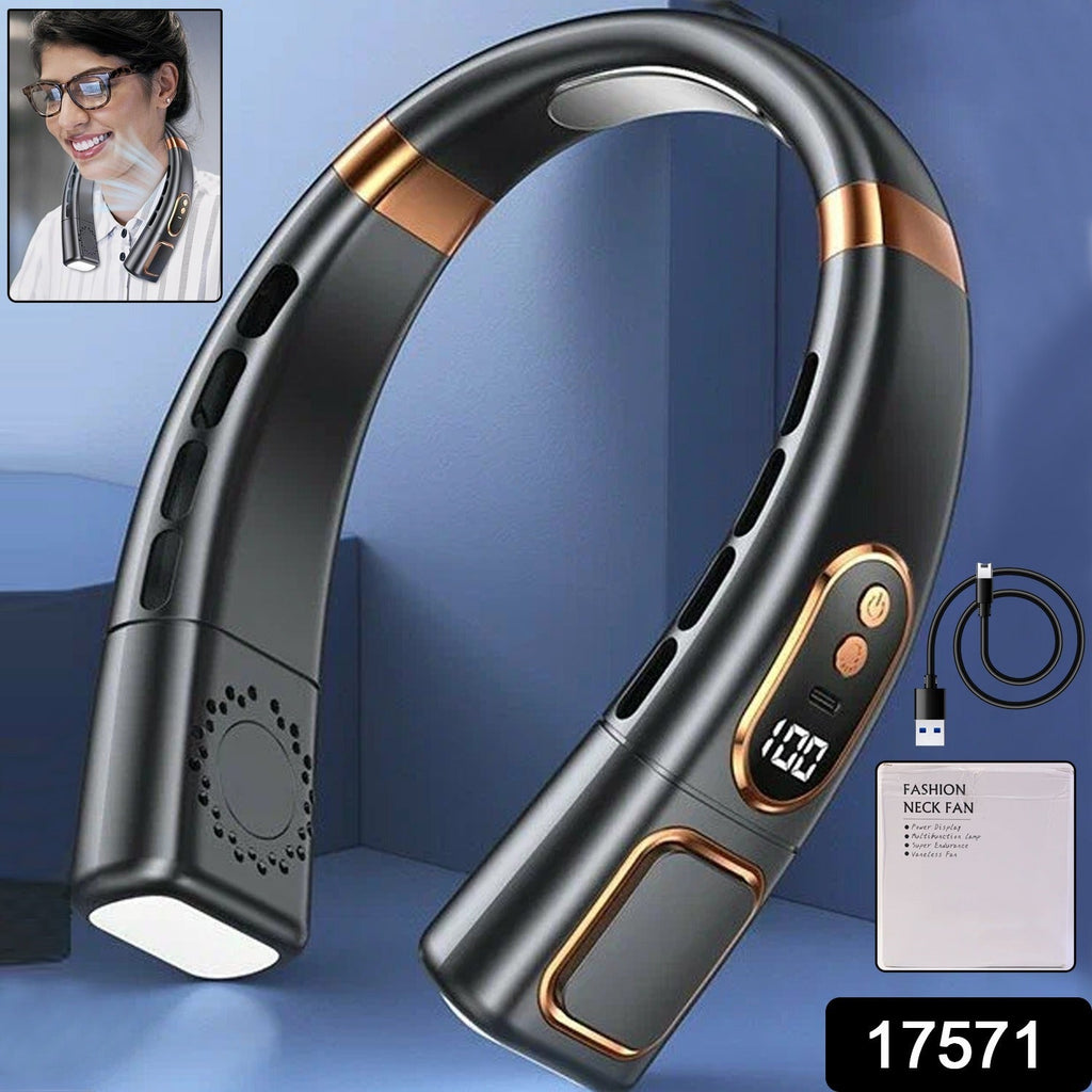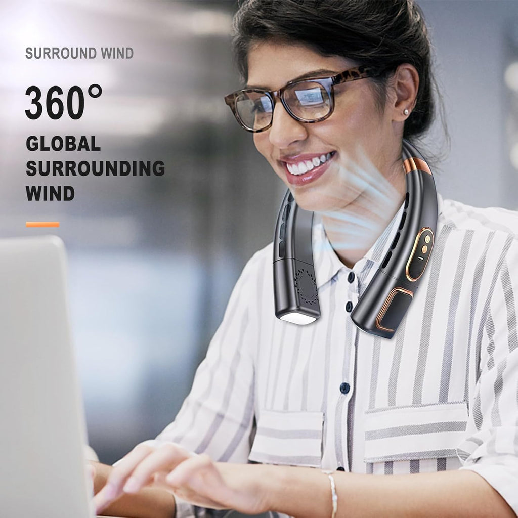 neck fan, wearable fan, USB rechargeable neck fan,personal cooling fan, hands free fan, digital display fan, LED light neck fan, portable cooling fan,portable USB fan, rechargeable wearable fan,summer cooling device, personal air cooler, stylish neck fan